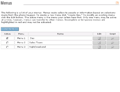 Menus allow you to present options to your callers that correspond to numbers and symbols on the phone keypad. A Menu can transfer callers to any phone number, an Extension, another Menu, a Hunt Group (list of phone numbers), or a Bulletin (out –going message). You select what you wish each key to do, then record a greeting to instruct your callers accordingly. You must set up a minimum of at least one Menu for Hosted PBX Automated Attendant to function properly.