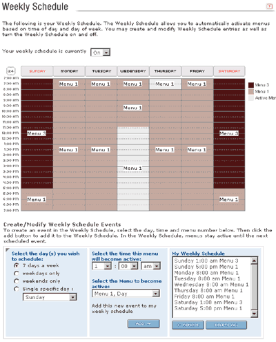 The Weekly Schedule allows you to automatically activate specific Menus at predetermined times and days. You may want to present one Menu during business hours, and a different one after hours and on weekends. The Weekly Schedule will automatically activate the Menus you specify at the time and day of the week given for each Menu.